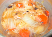 最初の冷燻にしたマスの残りの頭と骨はもちろん捨てない。塩をしておいたのをシモフリ(熱湯にさっとくぐらせ冷水にとり、ソージする)にして圧力鍋で40分。その煮汁に今回は冷蔵庫から出てきた5ヶ月前とった白菜と人参を入れて煮た。ヘラ(舌)に感覚を集中して味をつける。塩と醤油少々、甘みは加えない。そのスープを吸う。野菜とマスのうまみが合わさり、すっきりしているのにコクがある。うーん。思いついて柚子コショウ少々。でノーサラうまい。和食では吸い物の香辛料をクチという。画龍点晴。骨も頭も野菜ももりもり食う。からだの芯からうまい。真にうまい。